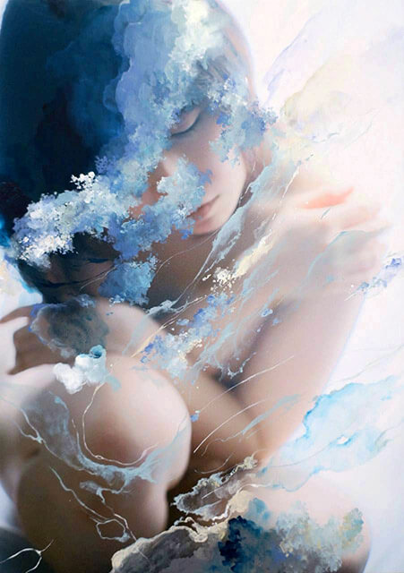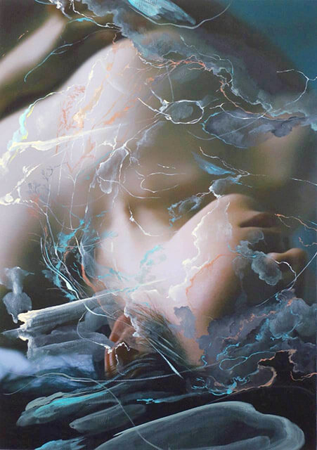 意図的ではない、ありのままの自身の身体を写真に写し出しています。それでも、本質の様々な要素は目には見えません。裸の上に更に絵を描くというのは、その目に見えない要素を可視化する行為です。様々な色で彩り、あるいは汚すように、影や光、隠したいもの、さらけ出したいものを何層にも重ね、内面を投影させています。隠してしまった、忘れてしまった本質を形にできるように。